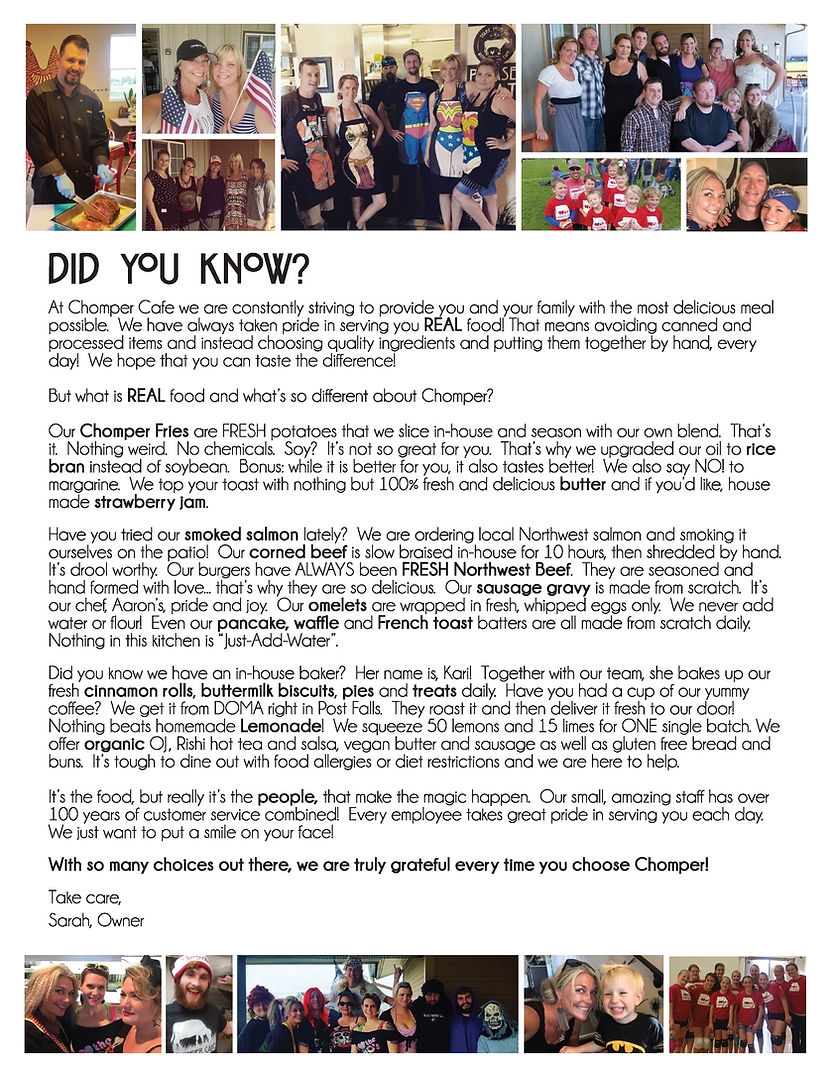 Hello! I get a lot of questions about my background and why I opened a restaurant! I'll start with telling you a little bit about me. My name is Sarah, I own Chomper Cafe, and I have lived here for most of my life. I was born in Palm Desert (oh NO, another Californian!) My mom did not want to raise her kids in southern California because of how much it was changing, so we moved to Coeur d'Alene in 1985. Other than living in Spokane for about 8 years, I've been here in Idaho ever since. It's where I'm raising my kids now. I love the mountains, the lakes, the rivers, the smiling people, the fresh air, the community. The Northwest really is one of a kind.